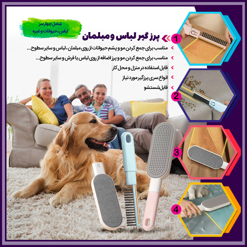 مزایای استفاده از پرزگیر حیوانات ۴ کاره:استفاده از پرزگیر ۴ کاره مزایای متعددی دارد که آن را به انتخابی هوشمندانه برای صاحبان حیوانات خانگی تبدیل میکند: